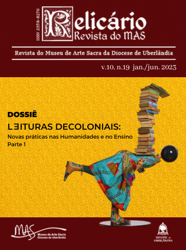 É com grande satisfação que a Revista Relicário, do Museu de Arte Sacra da Diocese de Uberlândia, coloca no ar o seu V. 10 N. 19, com o DOSSIÊ “LEITURAS DECOLONIAIS: Novas práticas nas Humanidades e no Ensino – Parte I”. O desenvolvimento do tema por pesquisadores nas páginas deste número oferece subsídios valiosos para a compreensão dessa polêmica área de pesquisa, como o leitor poderá conferir na Apresentação dos artigos pelos organizadores do Dossiê, Profª Drª Ivete Batista da Silva Almeida (UFU) e Prof. Dr. José Benedito de Almeida Junior (UFU), a quem deixamos nossos agradecimentos por nos darem o prazer de recebê-los nessa edição da revista. Como está explicado na Apresentação, em virtude do grande volume de artigos recebidos, a temática foi dividida em duas partes: Parte I e Parte II, esta última a ser publicada no V.10 N.20 da revista