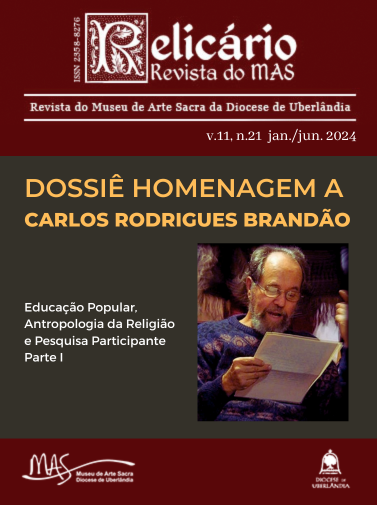 É com grande satisfação que a Revista Relicário, do Museu de Arte Sacra da Diocese de Uberlândia, coloca no ar o seu V. 11 N. 21, dedicado exclusivamentea a um pensador que deixou  importante legado de mais de sessenta anos  à pesquisa  no Brasil, na América- Latina e Europa. Esta edição, por meio do seu  Dossiê e de todas as seções da revista presta homenagem póstuma ao amigo, professor e pesquisador CARLOS RODRIGUES BRANDÃO (1940-2023) – autor de uma vasta obra, que se desdobra em inúmeros segmentos. Seu pensamento impactou gerações de intelectuais provenientes de diferentes áreas do conhecimento, com destaque para a Antropologia da Religião, a Educação Popular, Pesquisa Participante,  Geografia e Ciências da Religião, aqui representadas pelas organizadoras – Flávia Ribeiro Amaro, Fernanda dos Santos Paulo e Angela Fagna. Gomes de Souza.